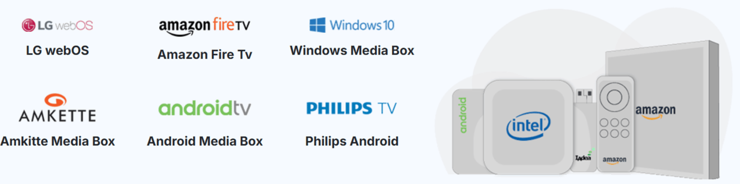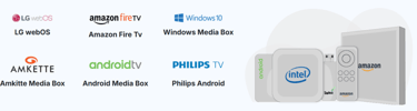 We provide support for a range of platforms, including LG webOS, Philips Android, Panasonic Android, Amazon Fire Stick, Amkette media box, Windows media box, and any Android display equipped with Play Store access.