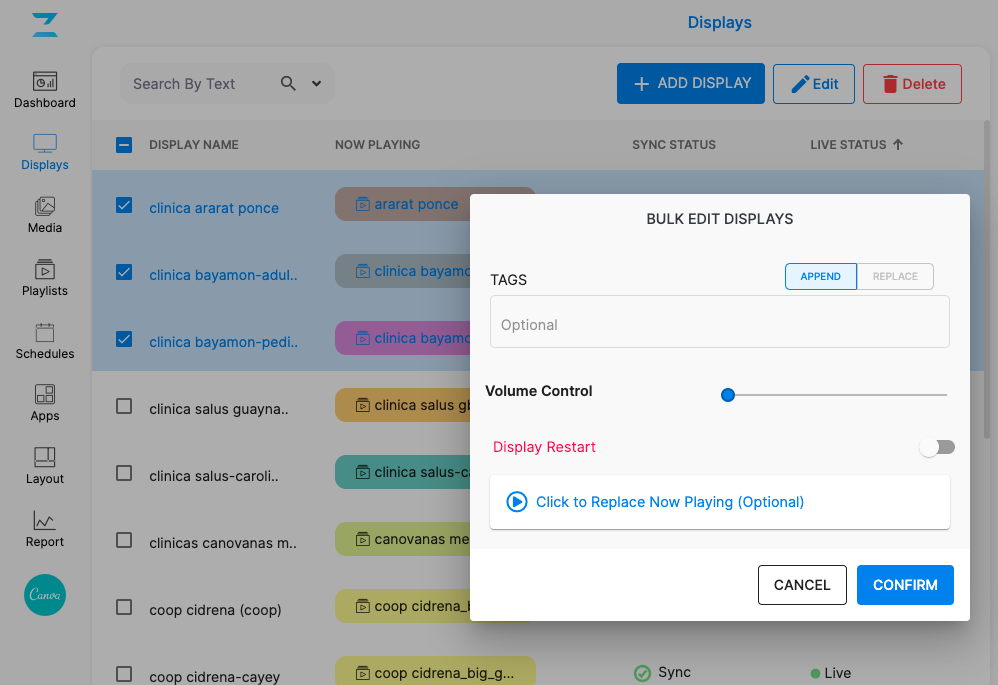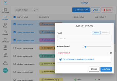 1. Display Bulk edit: Changing the display content or adjusting the volume of displays one by one is easy when you have a limited number of displays. The statement doesn’t hold good when you have 100 or 1000 displays. You would definitely want to edit a group of displays and that’s where this “Bulk Display Edit feature” comes into play. You can select a group of displays and make the changes (Content, reboot or others) to all the selected displays in one single go.